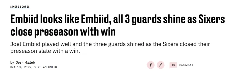 [敲鐘社·翻譯]比賽總結(jié):恩比德回歸首秀狀態(tài)尚可,敲鐘齊閃前賽三后衛(wèi)齊閃耀季前賽終獲首勝由逆風翻盤_Li 發(fā)表在76人專區(qū) https://bbs.hupu.com/sixers
