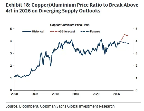 舉個例子之前說過銅鋁替代邏輯。如果銅價過高過快上漲,將加速在周期性領(lǐng)域(如低壓能源電纜、電器和工業(yè)應(yīng)用中的繞組線)用鋁替代銅,這將為銅價設(shè)定上限。銅鋁價格比率超過4:1時,替代會加速,這自2010年以來已被證明是銅價的上限。